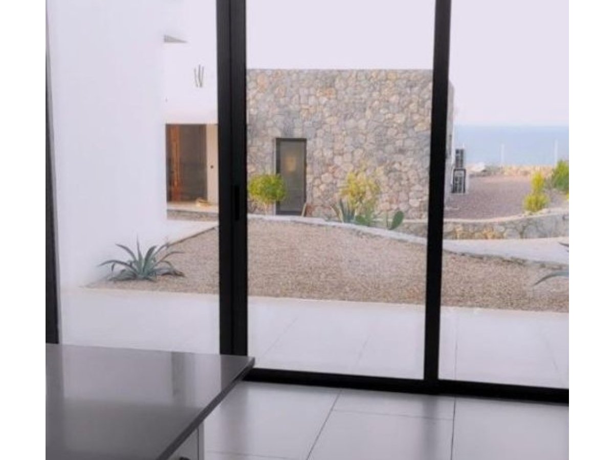 Daire açık plan salon, mutfak, yemek alanı ve kesintisiz güzel deniz manzaralı terasa erişimi olan modern ve rahat.