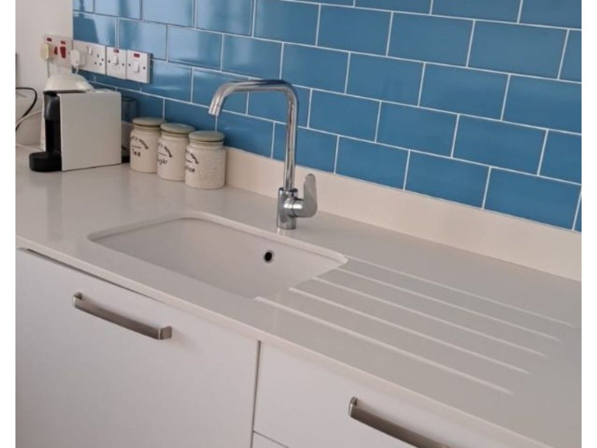 Bu açık plan yaşam alanı, entegre ocak ve ocak içeren ayrı bir mutfak adasına sahip hazır bir mutfak içermektedir.