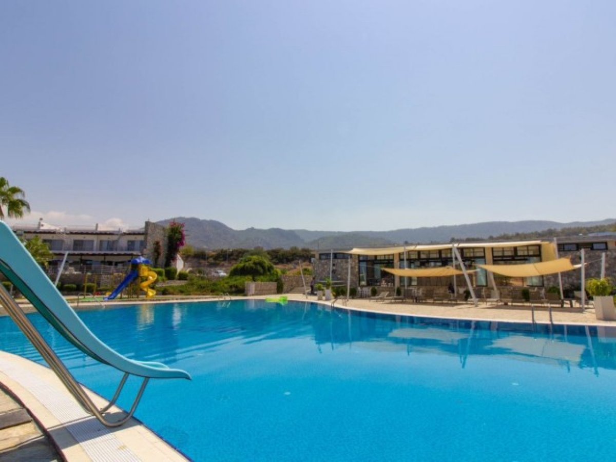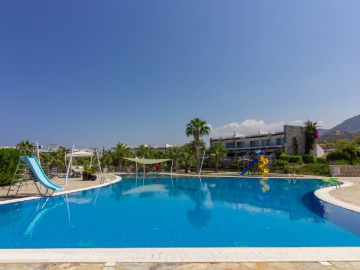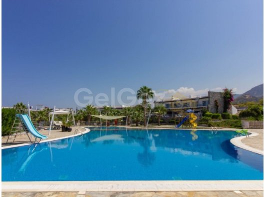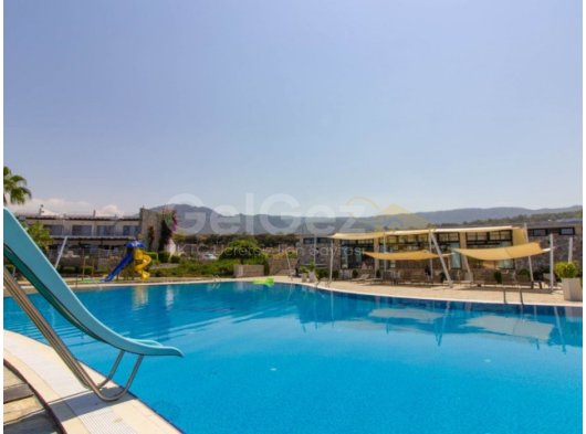 1 yatak odalı denize sıfır daire + ortak yüzme havuzu + site içi + Deniz ve Dağ manzarası + plaja yürüme mesafesinde.
