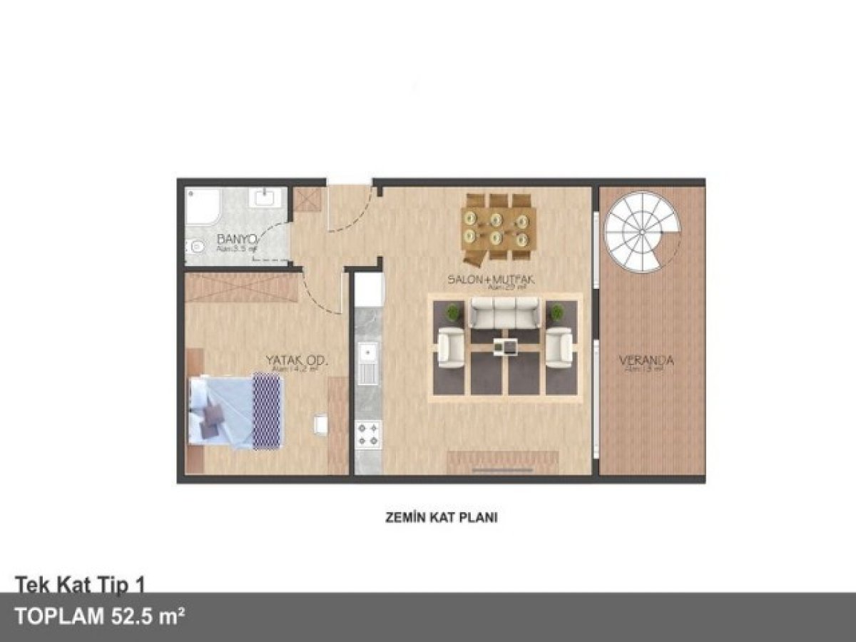 - Toplam 52,5 m2 alana sahip 14 daire 1+1. İkinci kattaki daireler özel çatı terasına sahiptir.