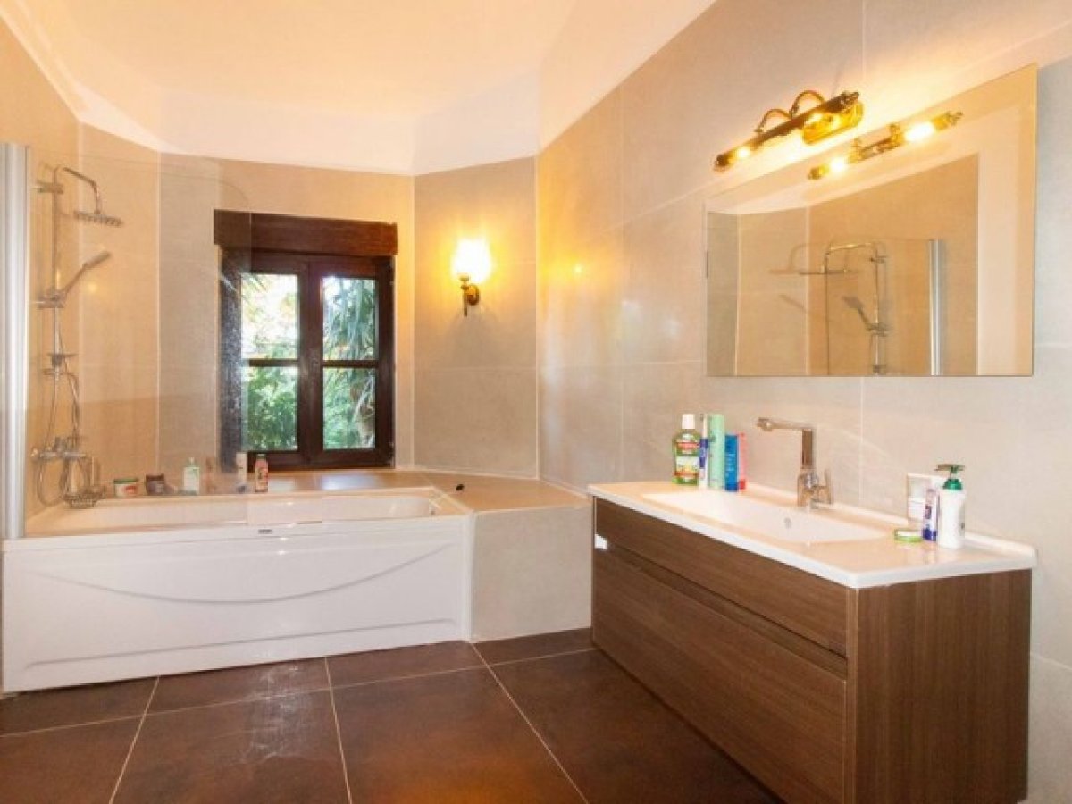 1990'ların başında inşa edilen ve yakın zamanda yüksek standartlarda yenilenen bu eşsiz mülk gerçekten etkileyici. Villa, palmiye ağaçları, çeşitli bitki örtüsü ve rengarenk çiçekler içeren kurulu bir bahçeye sahip geniş bir arsa üzerinde yer almaktadır. Bu yemyeşil, gözlerden uzak vaha, huzur, rahatlama ve mahremiyet sunarken, temel olanaklara arabayla sadece 10 dakikalık mesafededir.
