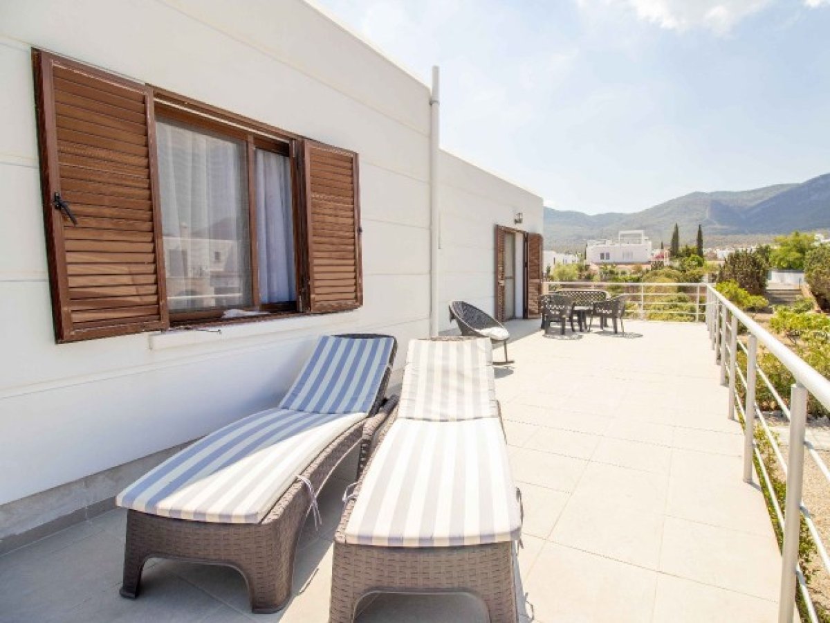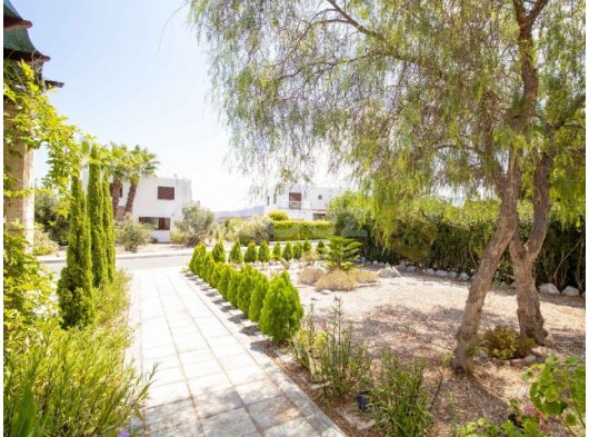 Villanın çevresi meyve ağaçları ve çiçekli bitkilerle dolu olgun bir bahçe ile çevrilidir. İki araçlık özel otopark alanı vardır. Dış mekân yaşamı oldukça keyiflidir: zemin katta geniş bir teras ve üst katta dağ ve deniz manzaralı açık bir teras bulunuyor. Arka bölümde yer alan yazlık mutfak, keyifli bir bahçeye açılmakta olup açık havada yemekler için idealdir.