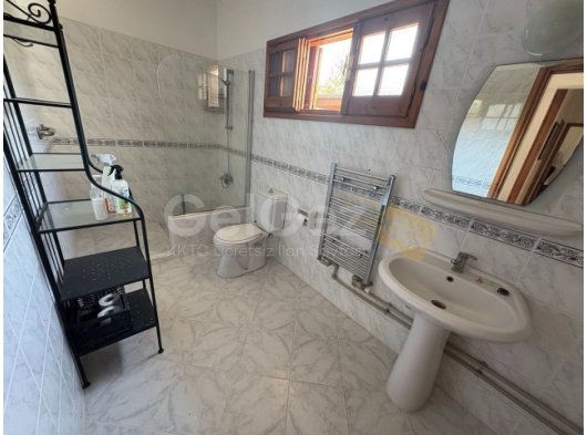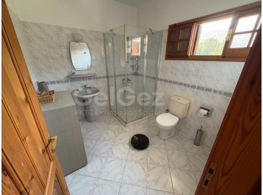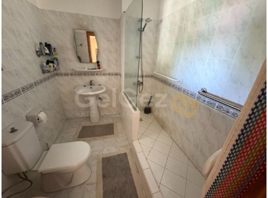 Aile Banyosu / Tuvalet - Ön tarafa bakan buzlu cam pencere, duşakabin, duvara monte su ısıtıcısı, lavabolu makyaj masası, krom bataryalar ve ayna, gömme dolap ve alçak tuvalet içeren iyi döşenmiş banyo. Uyumlu fayans duvar kaplaması.