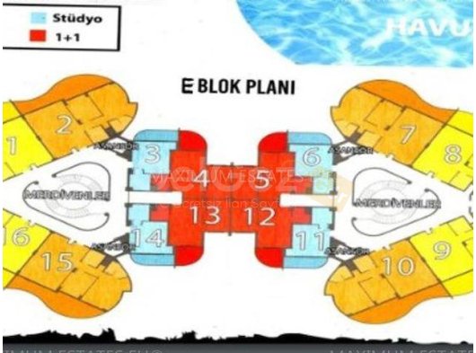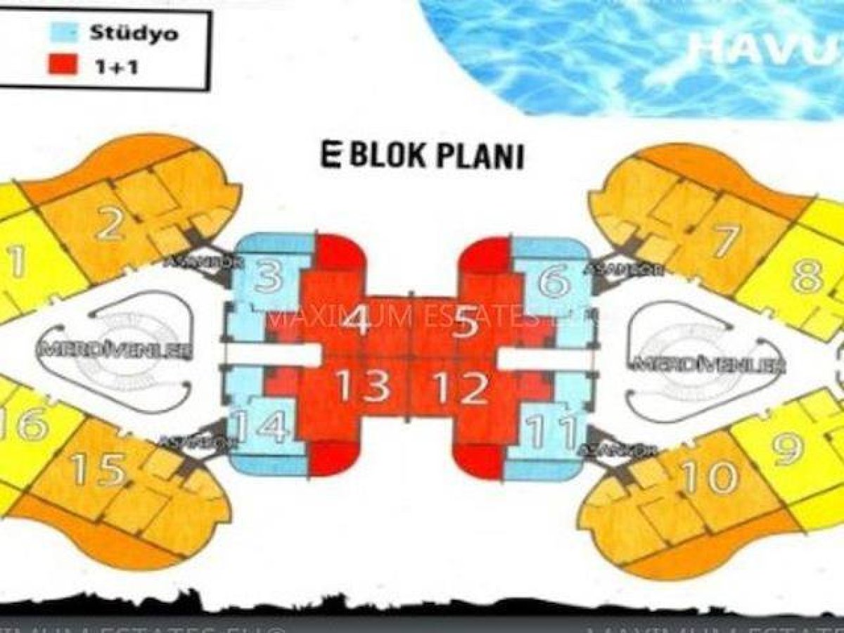 Stüdyo yapımı tamamlanan E bloğun 7. katında yer almaktadır. Toplam alan 56 m², tropik havuza bakan balkonu 11 m²'dir.