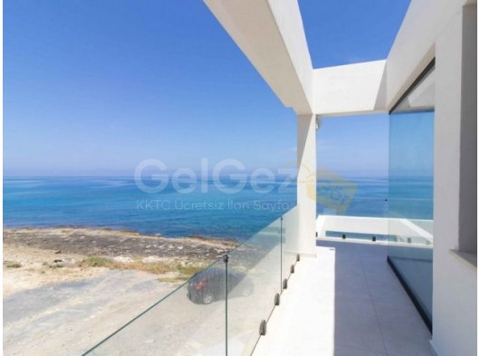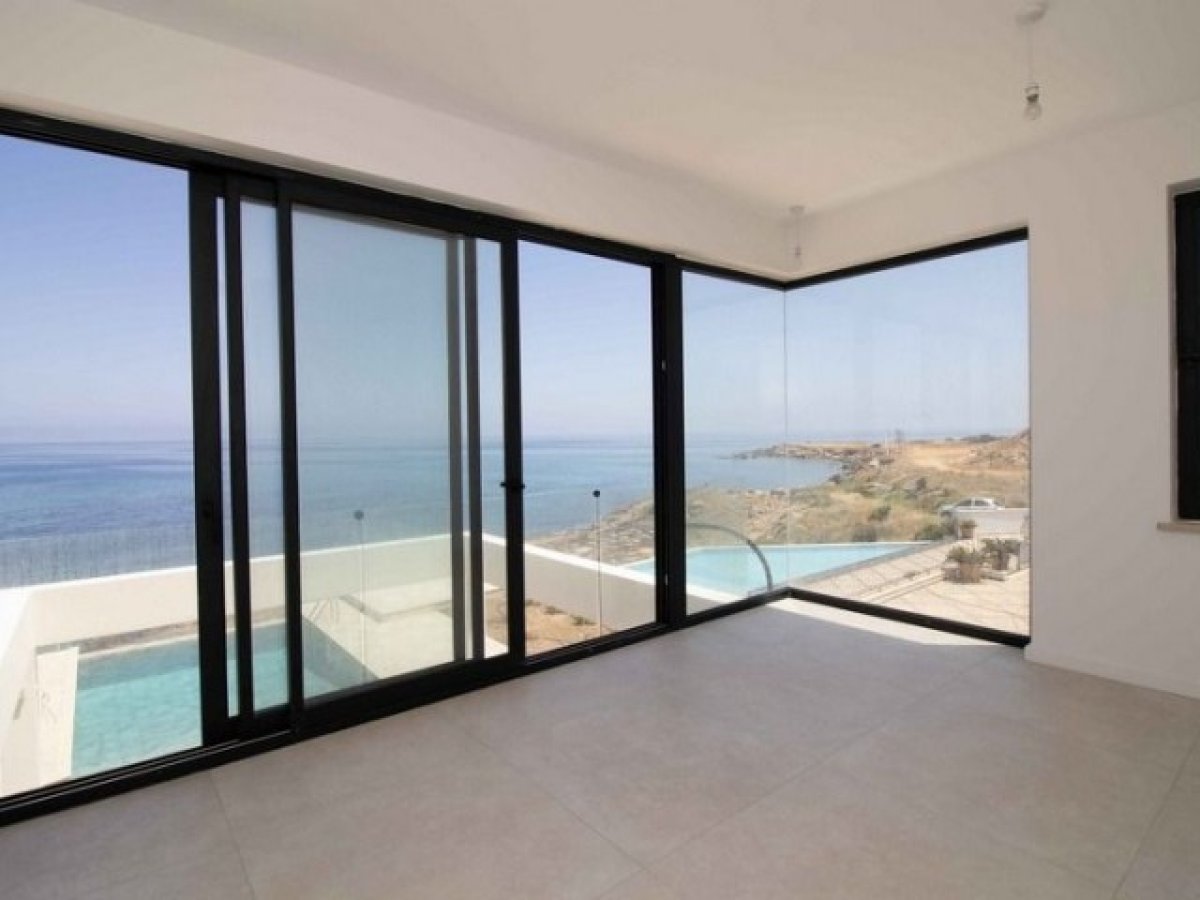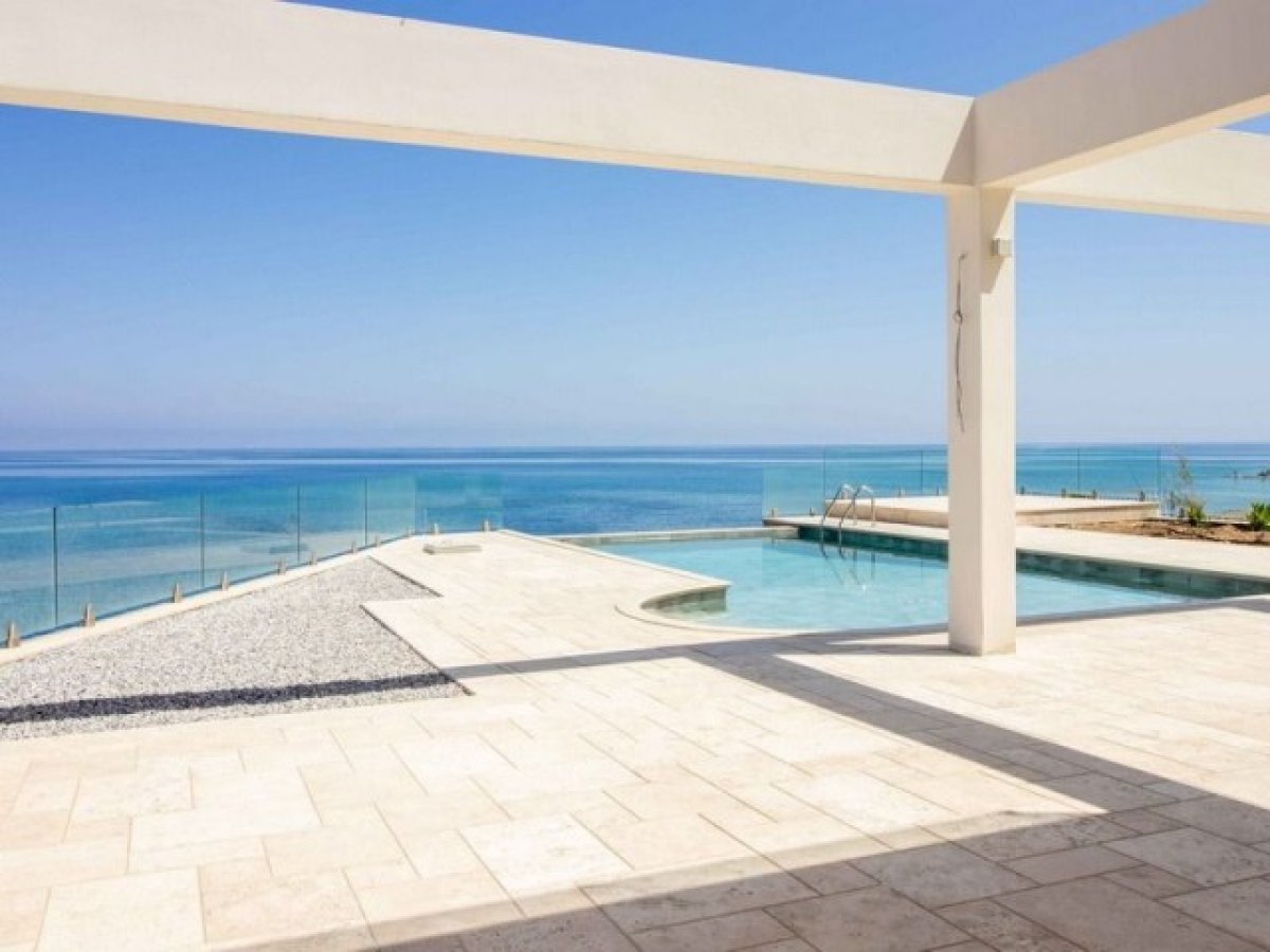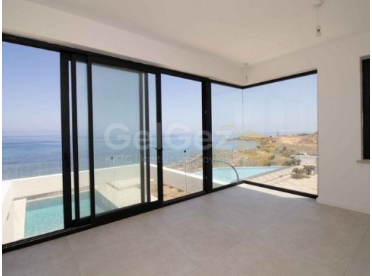 Dışarıda, villa ufukla kusursuz bir şekilde bütünleşen ve denizle görsel bir bağlantı oluşturan bir sonsuzluk havuzuna sahiptir. Çevreleyen cam çevre, panoramik manzarayı hiçbir şeyin bozmamasını sağlayarak villanın modern, minimalist estetiğini ve doğal çevreyle olan yakın ilişkisini güçlendirir.