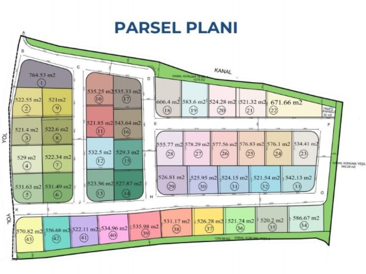 Parsel Alanları: 520 m² – 764 m²