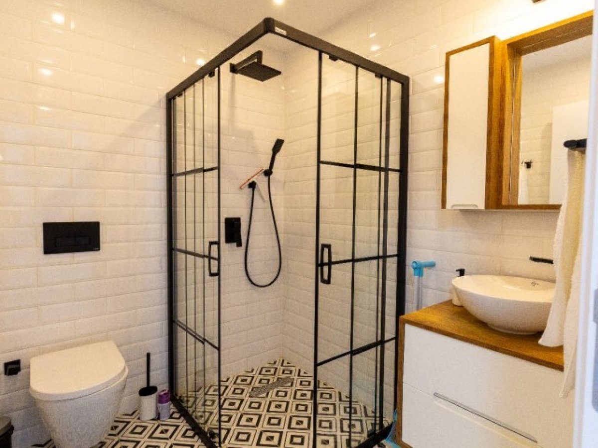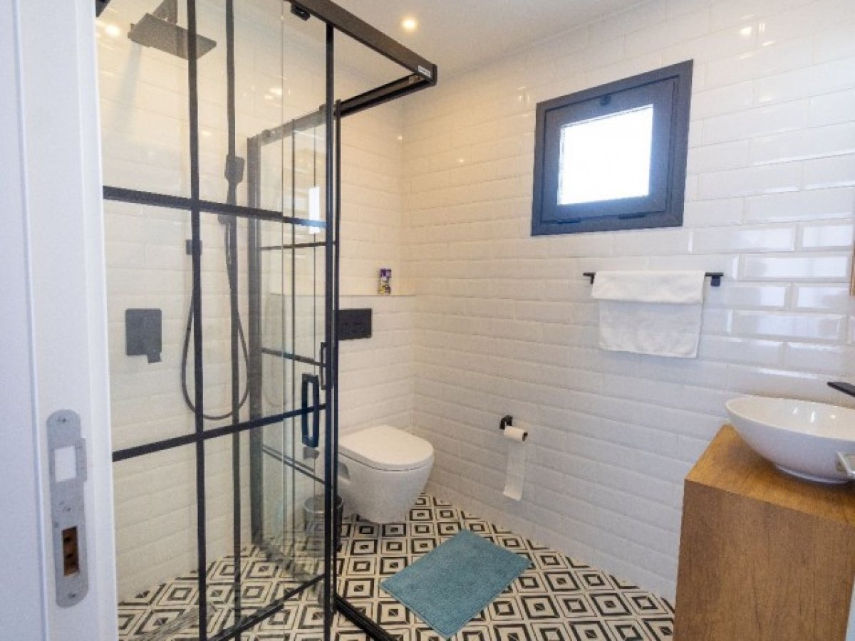 Duş kabini, tuvalet ve lavabo bulunan tam donanımlı banyolar. Seramik zemin.