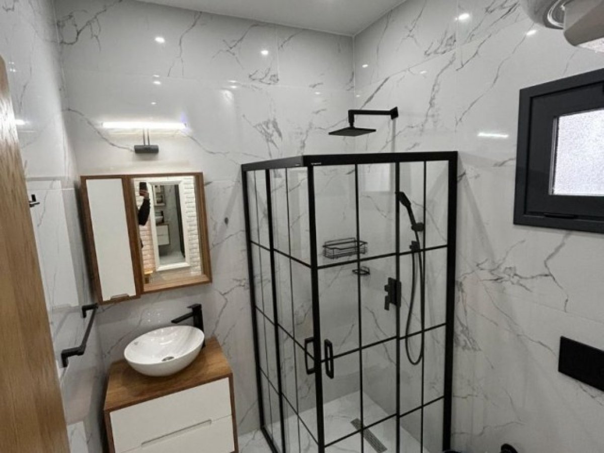 Duş kabini, tuvalet ve lavabo bulunan tam donanımlı banyo. Seramik zemin.