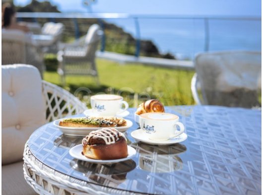 Akdeniz veya havuza bakan nefes kesici manzaralı geniş balkon. Tam konforunuz için masa ve sandalyelerle donatılmıştır.