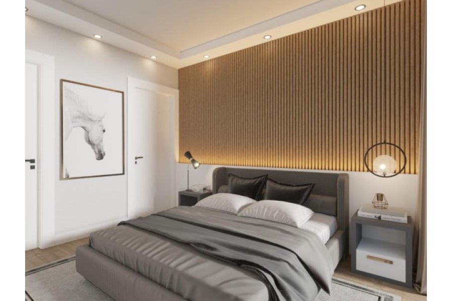 • Yatağın üstündeki duvarda ahşap duvar dekorasyonu