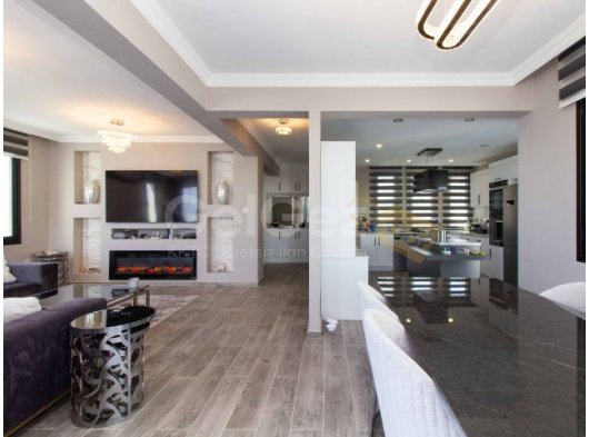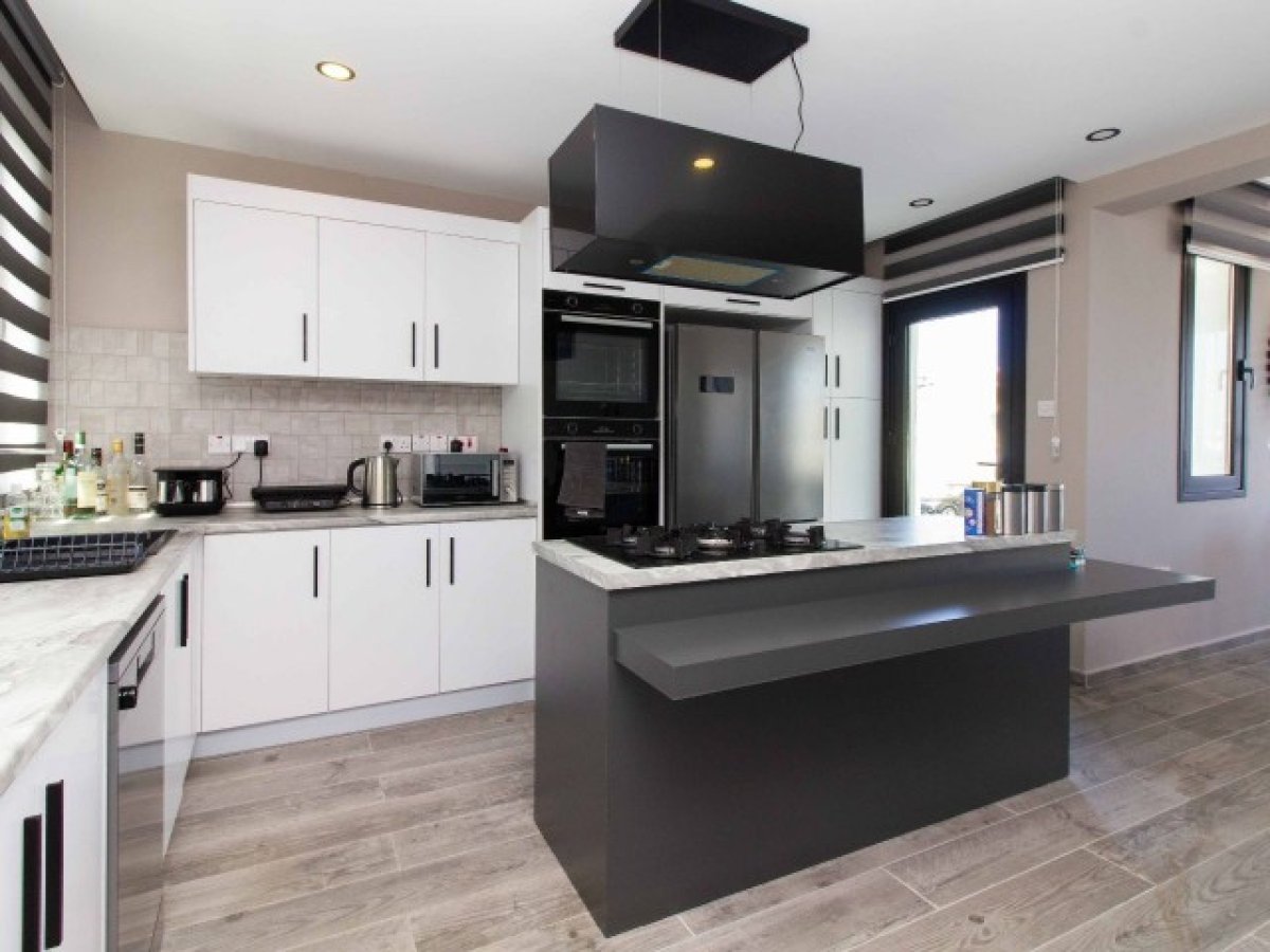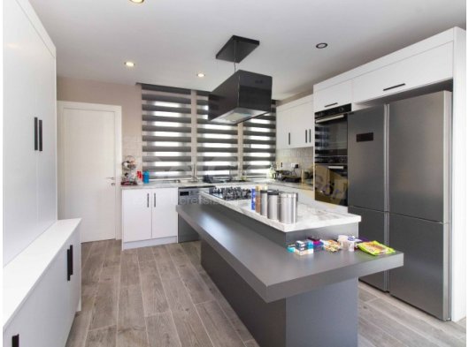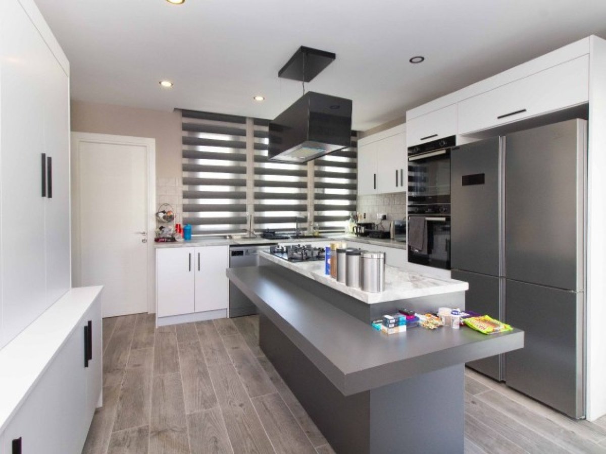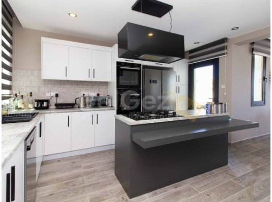 Villanın kalbine doğru bir adım attığınızda kendinizi stil ve işlevselliğin kusursuz bir şekilde harmanlandığı mutfakta bulacaksınız. Siyah ve beyaz dolaplar ve tezgahlar şık bir kontrast yaratırken, mutfağın merkezinde bulunan ada yemek hazırlamak için geniş bir alan sunmaktadır. Açık plan tasarımı, mutfağı yemek odasına bağlıyor.