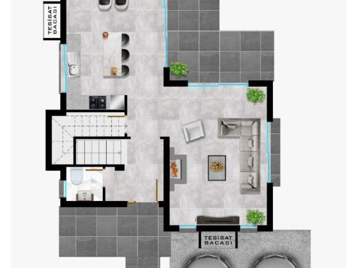 Açık plan mutfak ve oturma odası.