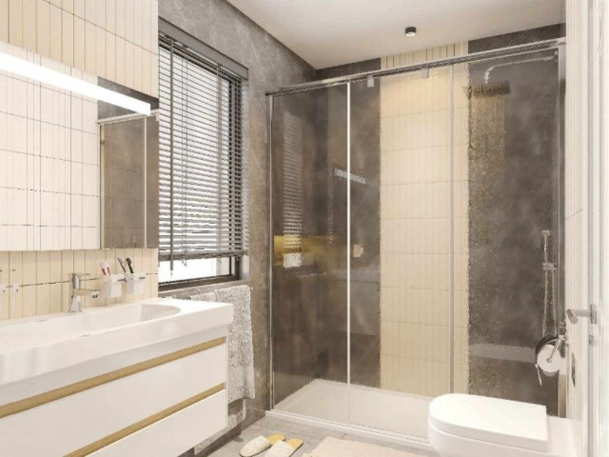 Duşlu ve gömme dolaplı ana yatak odası.