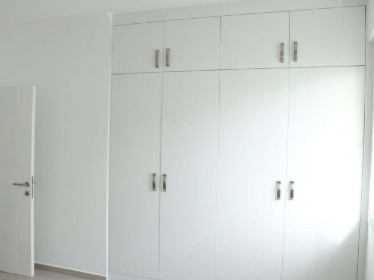 Yatak Odası 2: Yan tarafta pencere, tonozlu tavan, çeşitli gömme dolaplar ve parlak fayans zemin.