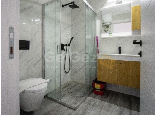 Duş kabini, tuvalet ve lavabo bulunan tam donanımlı banyo. Seramik zemin.
