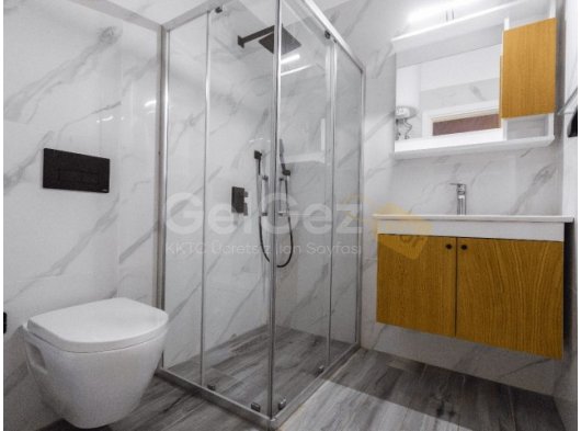 Duş kabini, tuvalet ve lavabo bulunan tam donanımlı banyo. Seramik zemin.