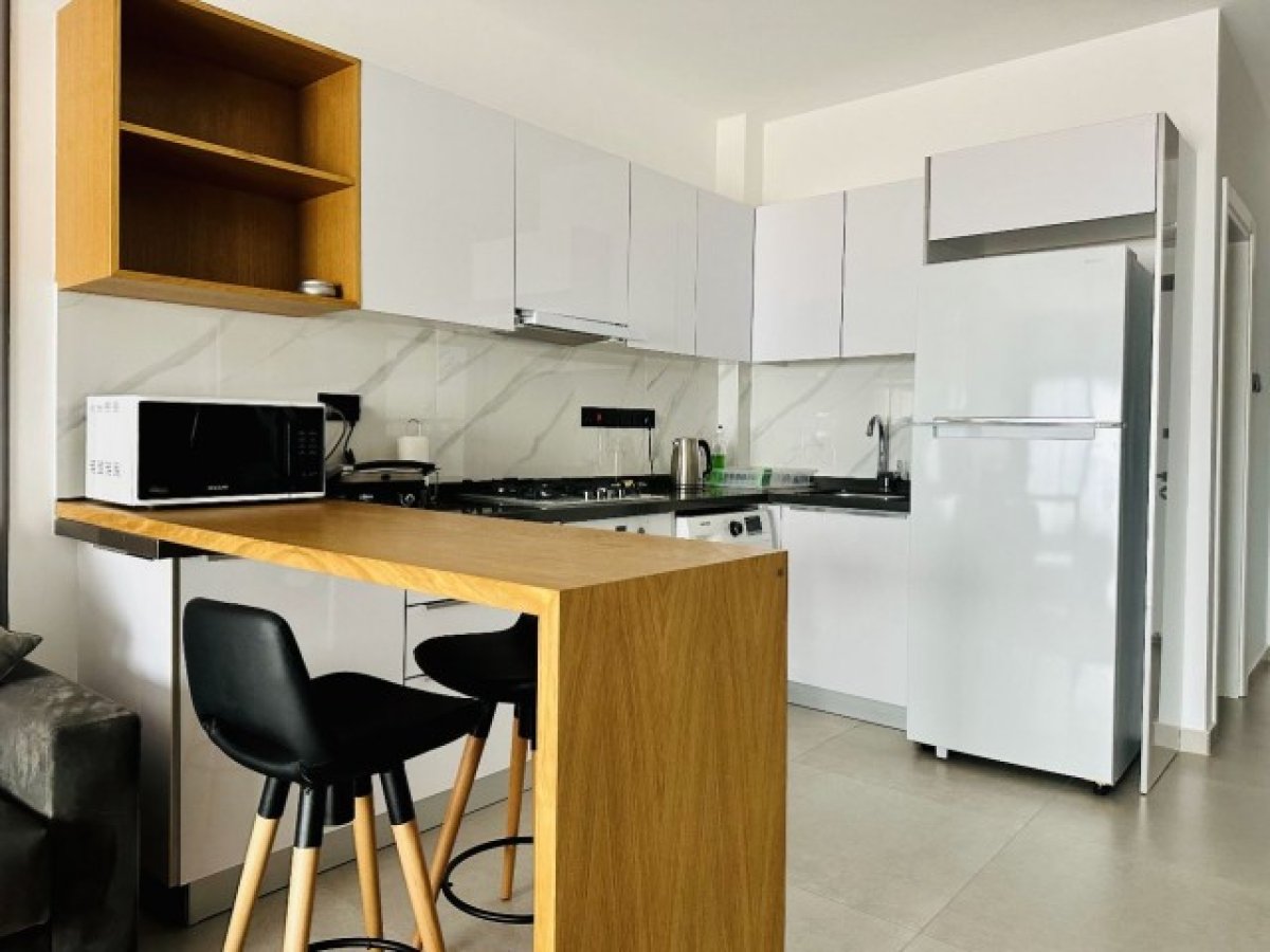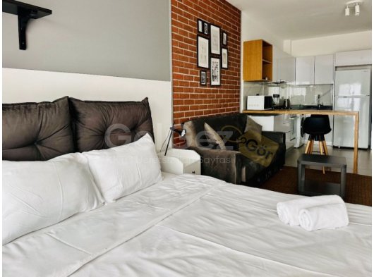 Daire tam donanımlı ve mobilyalı mutfak, oturma alanı ve yatak alanı sunmaktadır.