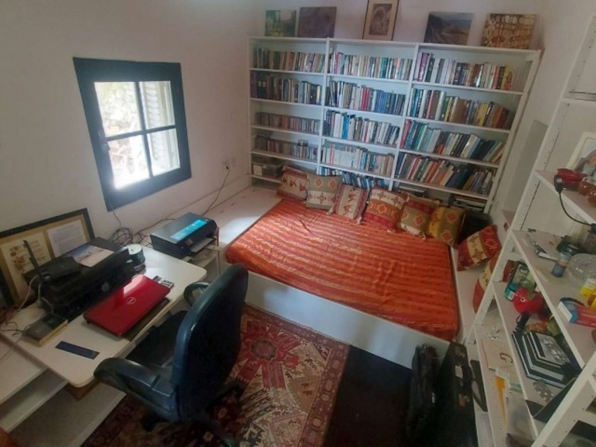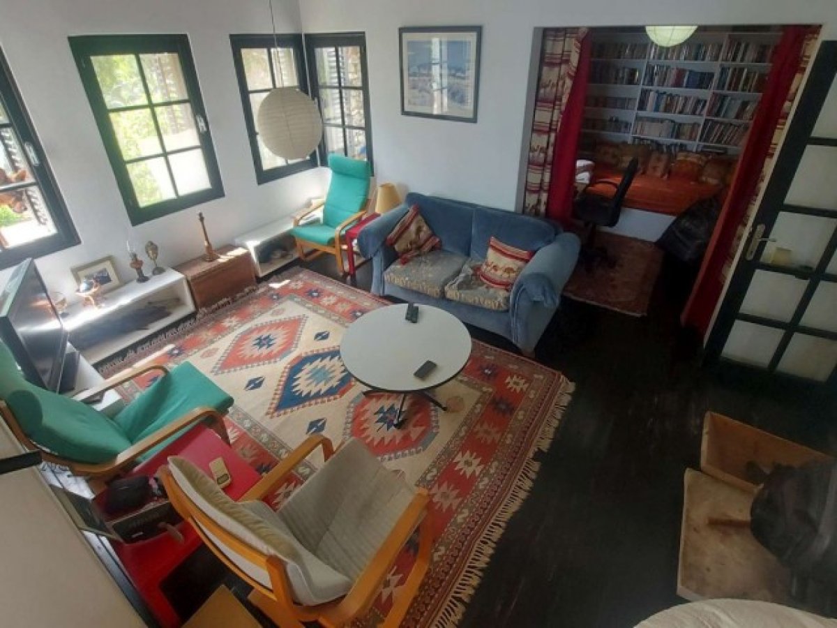 Oturma odası 3,5 m x 2,7 m. Ön cephede Akdeniz manzaralı cam kapı, aynalı önlü gardıroplar bir duvarı kaplayarak bol miktarda depolama alanı sunuyor, fayans zemin, merdivenlerle inilen: