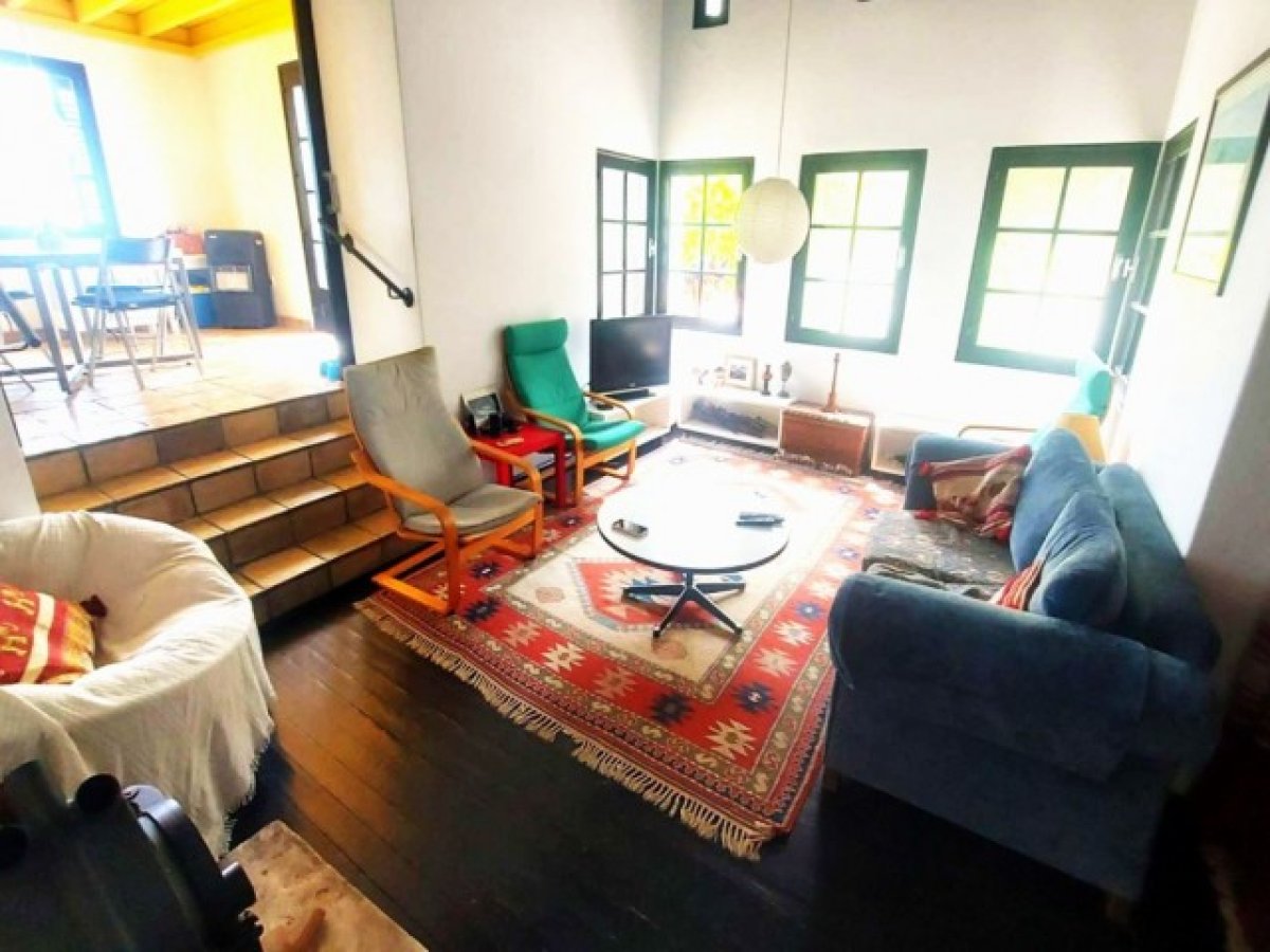 Oturma Odası 4,75 m x 3,35 m - Yüksek kirişli tavana sahip, büyüleyici bir çift cepheli oturma alanı, ayrıca pitoresk bahçelere bakan tam boy pencereler, tavan vantilatörü, duvara monte klima üniteleri, odun sobası!!! ahşap zemin, basamak: