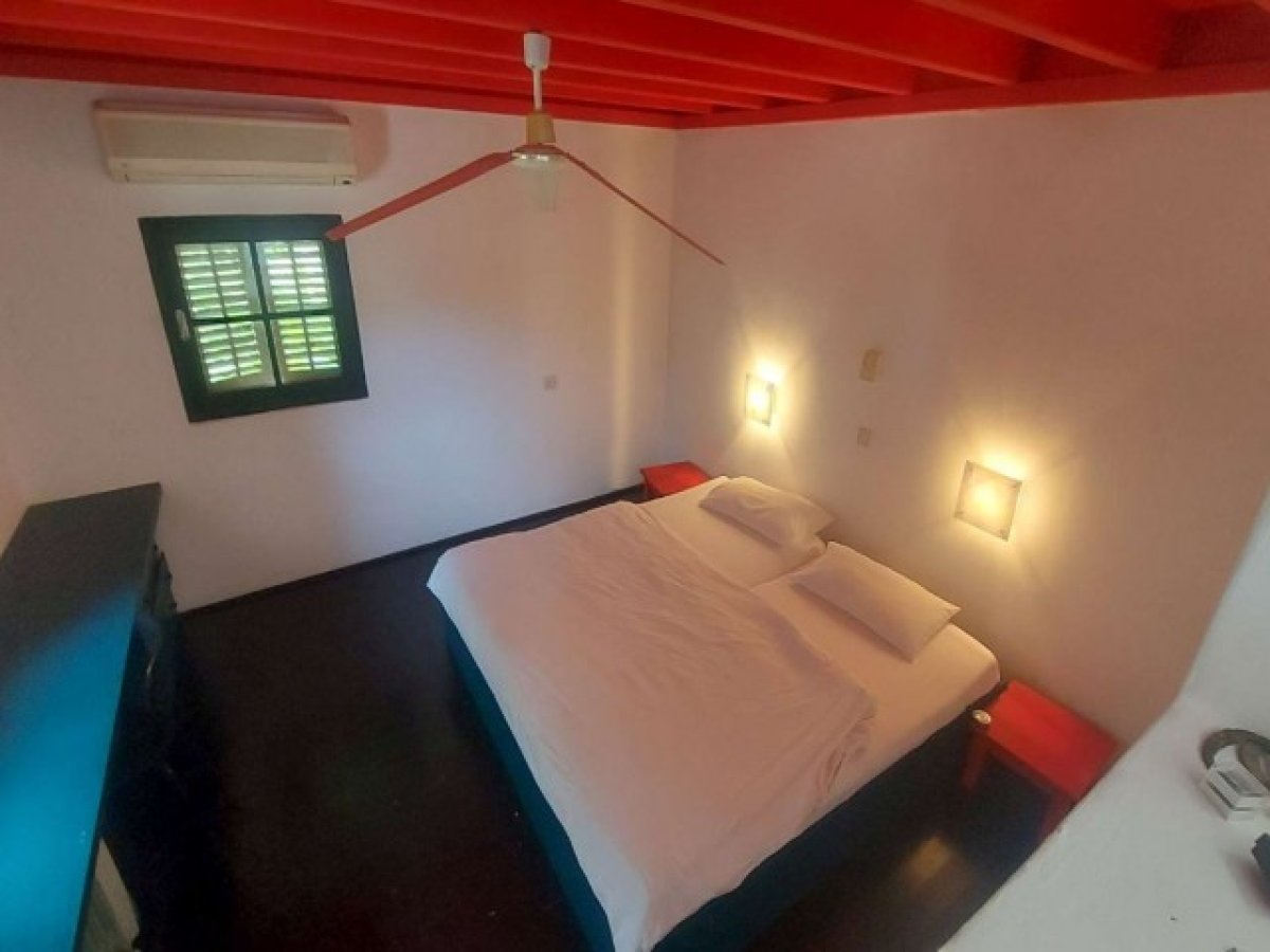 Yatak Odası 3 - 3,6 m x 3,6 m. - Ön ve yan tarafta pencereleri olan çift yönlü oda, kirişli tavan, tavan vantilatörü, duvara monte klima ünitesi, ahşap zemin.