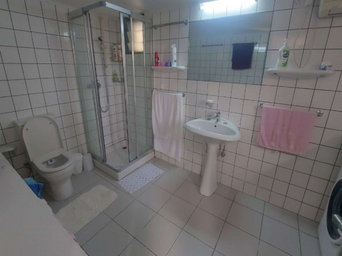 Duş Odası/WC - ön cephede pencere, sineklikli geniş köşe duş, alçak klozet, mikserli ayaklı lavabo, çamaşır makinesi tesisatı, fayans duvarlar ve zemin.