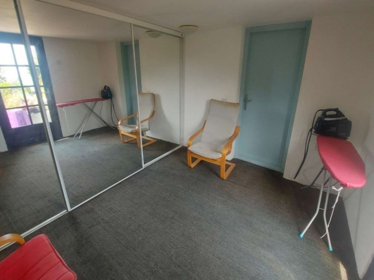 Oturma odası 3,6 m x 2,7 m Ön cepheye bakan cam kapı, Akdeniz manzaralı, aynalı önlü gardıroplar bir duvarı kaplayarak bol miktarda depolama alanı sunuyor, fayans zemin, aşağıdaki merdivenler: