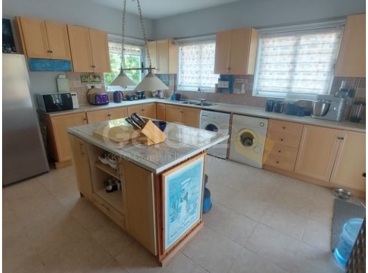 Mutfak - 4,83 m x 4,53 m - Arkada çift pencere, yanda yarı cam kapı ve diğer tarafta kapalı terasa, barbekü alanına ve özel yüzme havuzuna erişim sağlayan üç cepheli bir oda. Merkezi ada alt ünitesi, alt depolama alanı ve seramik tezgah, mikser musluklu gömme paslanmaz çelik evye, seramik karo sıçrama koruyucuları, bağımsız fırçalanmış krom gazlı ocak, çift buzdolabı ve dondurucu, çamaşır makinesi ve kurutma makinesi, karo zemin.