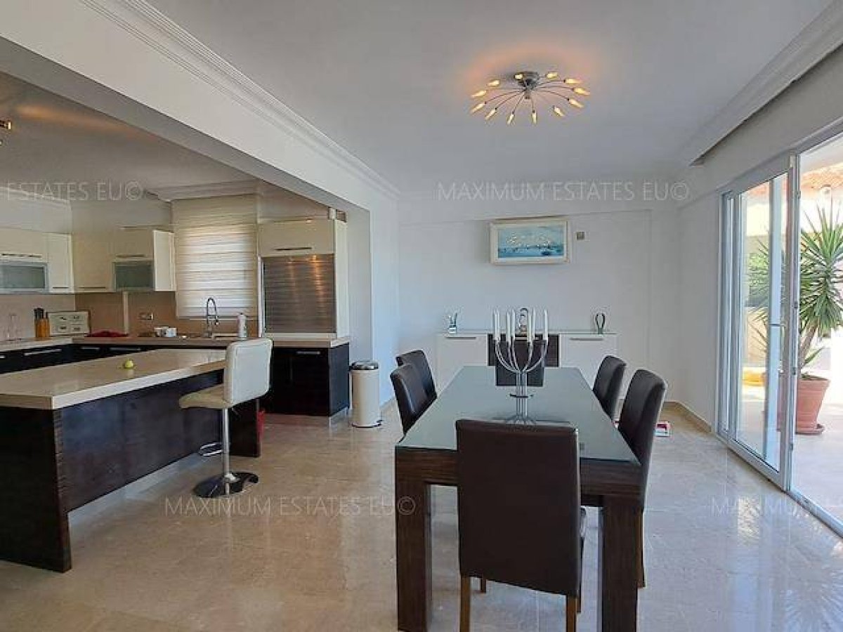 Geniş terasa ve deniz manzarasına açılan yemek odası