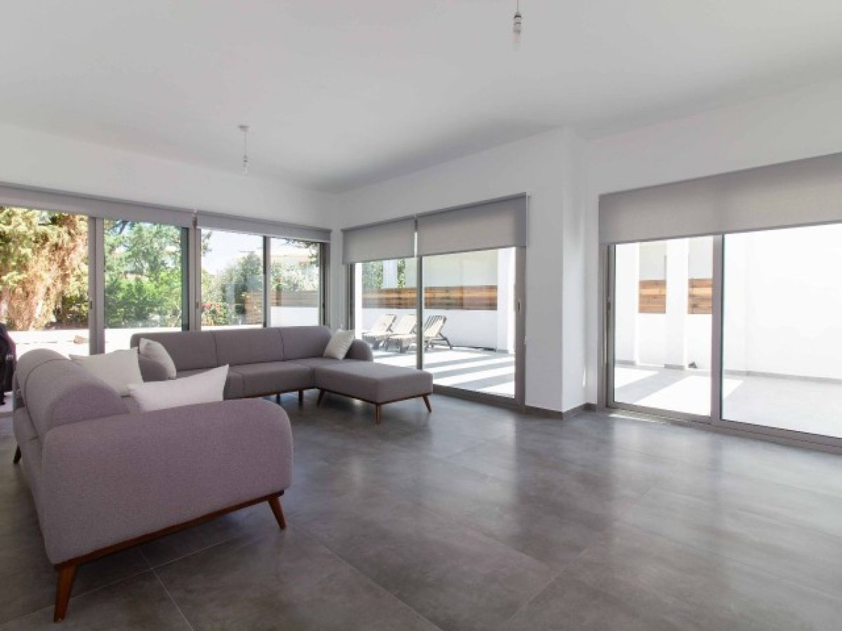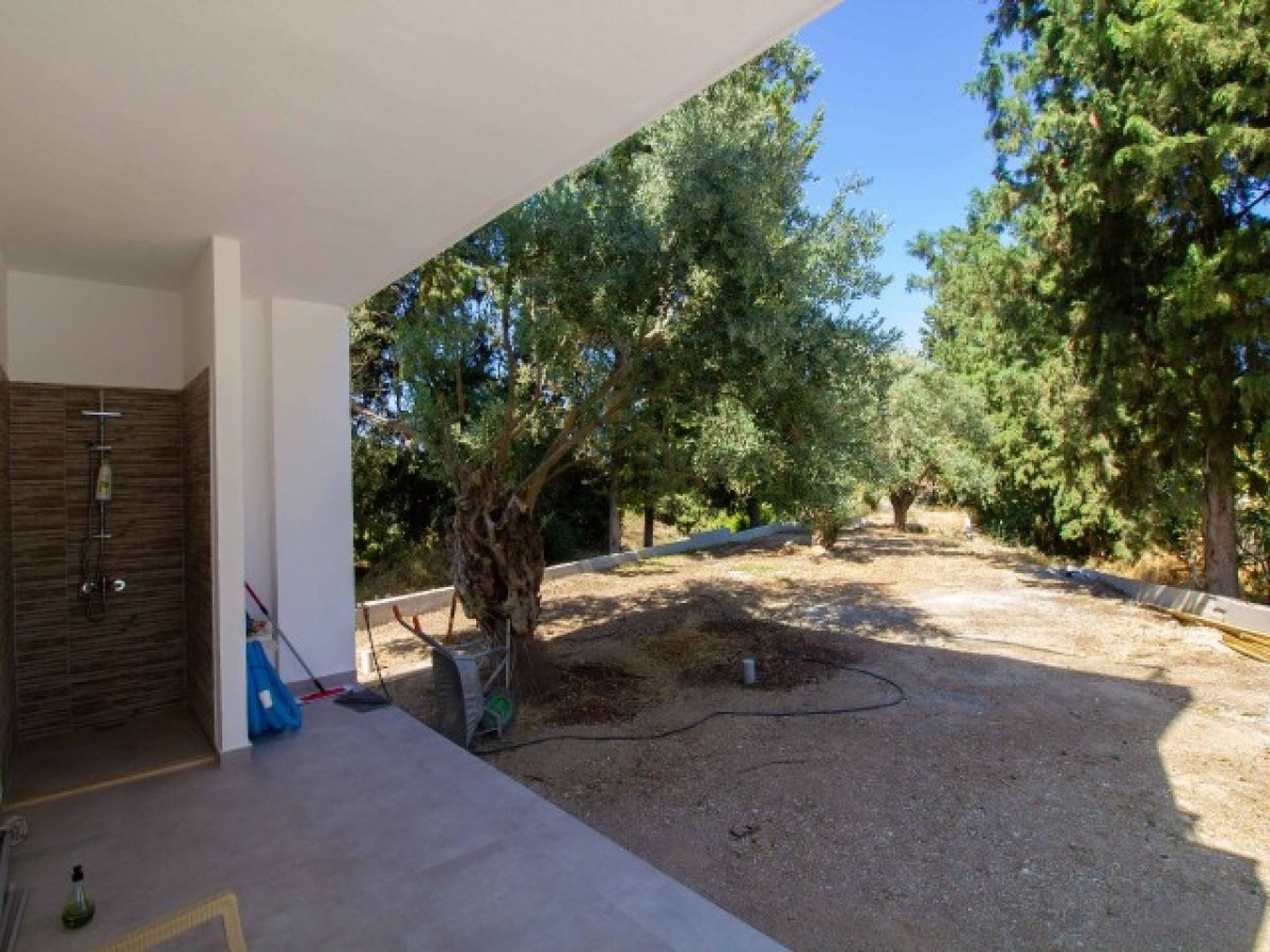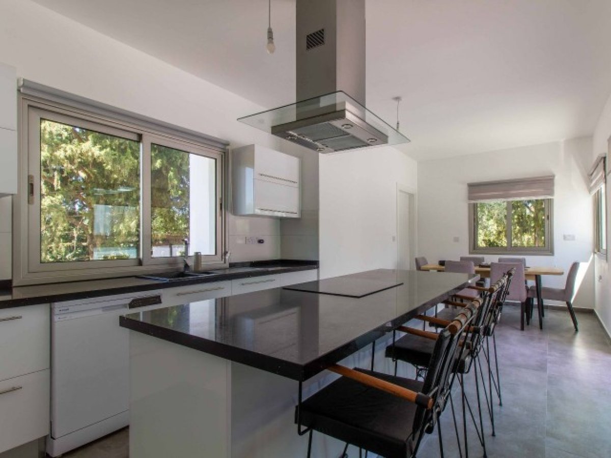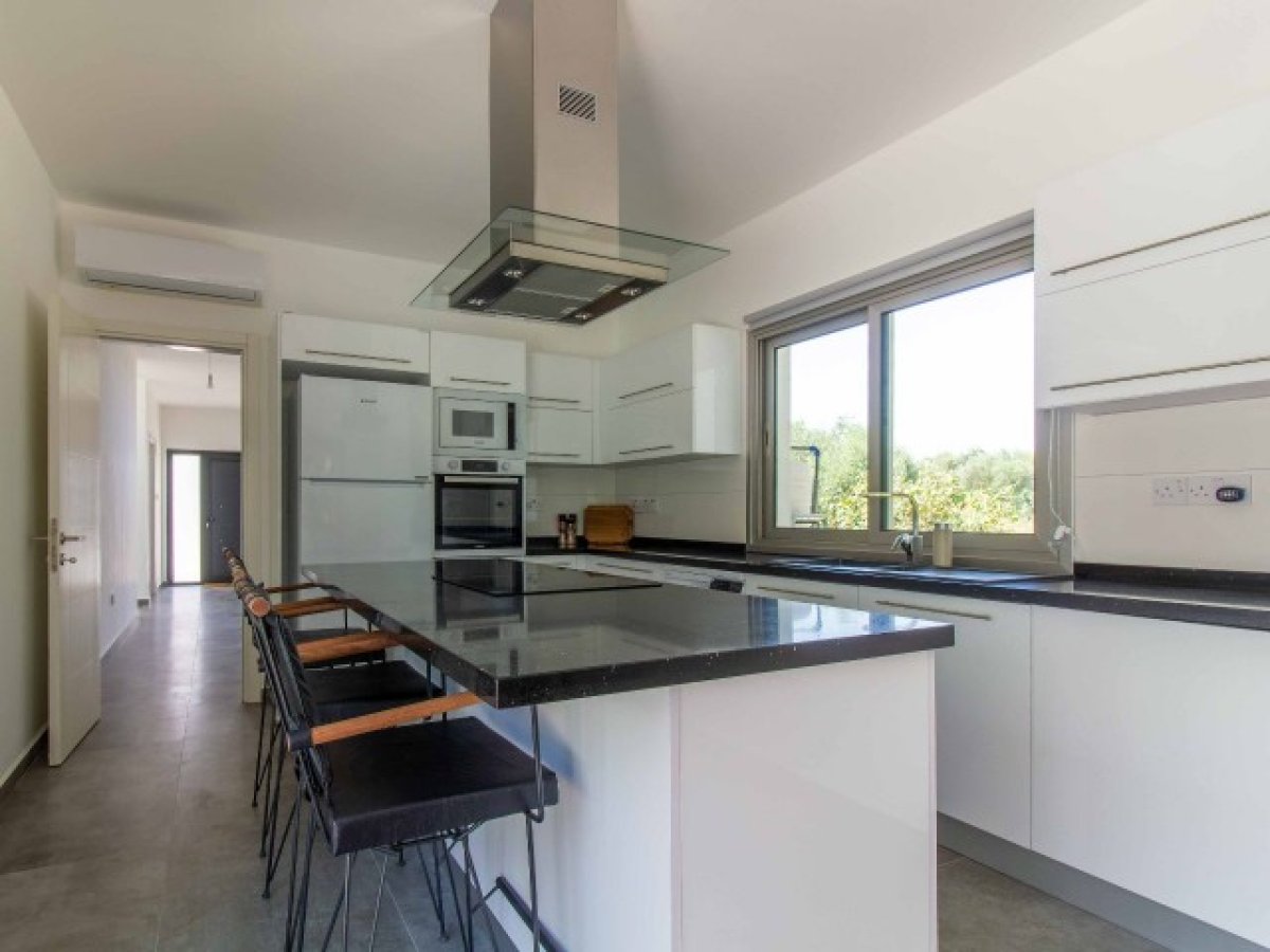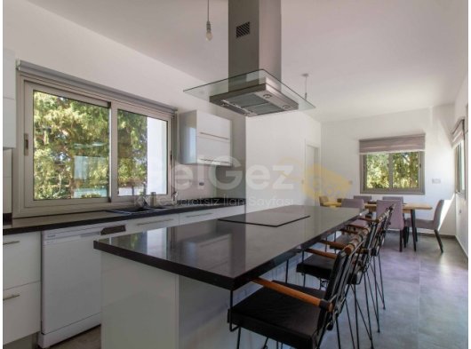 Eve girdiğinizde, modern merdivenlere sahip hoş bir giriş holü bulacaksınız. Salon alanı son derece geniştir ve geniş havuza ve kapalı teras alanına erişim sağlayan sürgülü kapılara sahip cam pencerelerle çevrilidir. Ortasında granit bir kahvaltı barı bulunan ayrı bir mutfak ve yemek alanı vardır. Tüm modern mutfak aletleri dahildir. Mutfak ayrıca dinlenmek, güneşlenmek ve nefes kesici gün batımının tadını çıkarmak için mükemmel bir yer olarak hizmet veren geniş teras alanına erişim sunmaktadır. Alan, uzun köklü çam ağaçları ve eski zeytin ağaçlarının bulunduğu geniş bir bahçeye bakmakta ve geniş bir mahremiyet sağlamaktadır. Ayrıca, açık hava keyfi için kapalı bir alan bulunmaktadır.