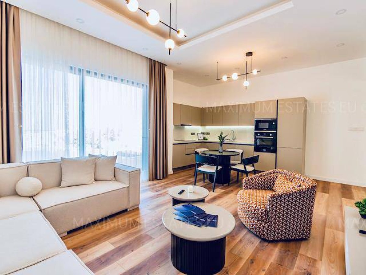 • 1. sınıf mutfak, soft-touch mat renkli dolaplar, kuvars kompozit tezgah, 1. sınıf armatür (beyaz eşyasız).