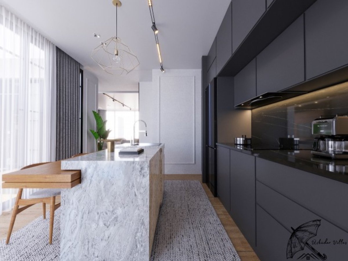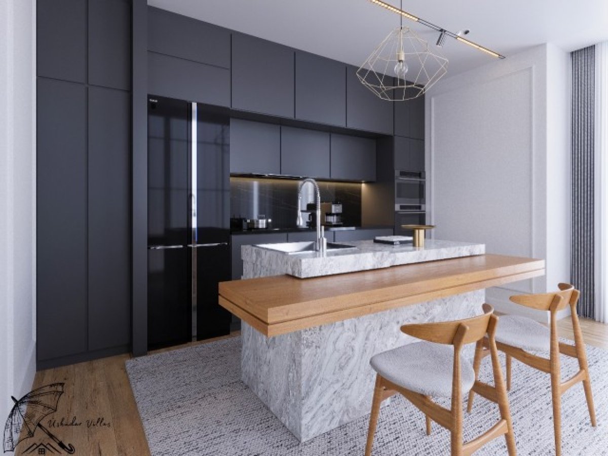 Modern, yüksek kaliteli malzemelerle döşenmiş şık mutfak