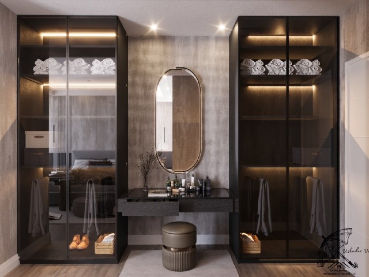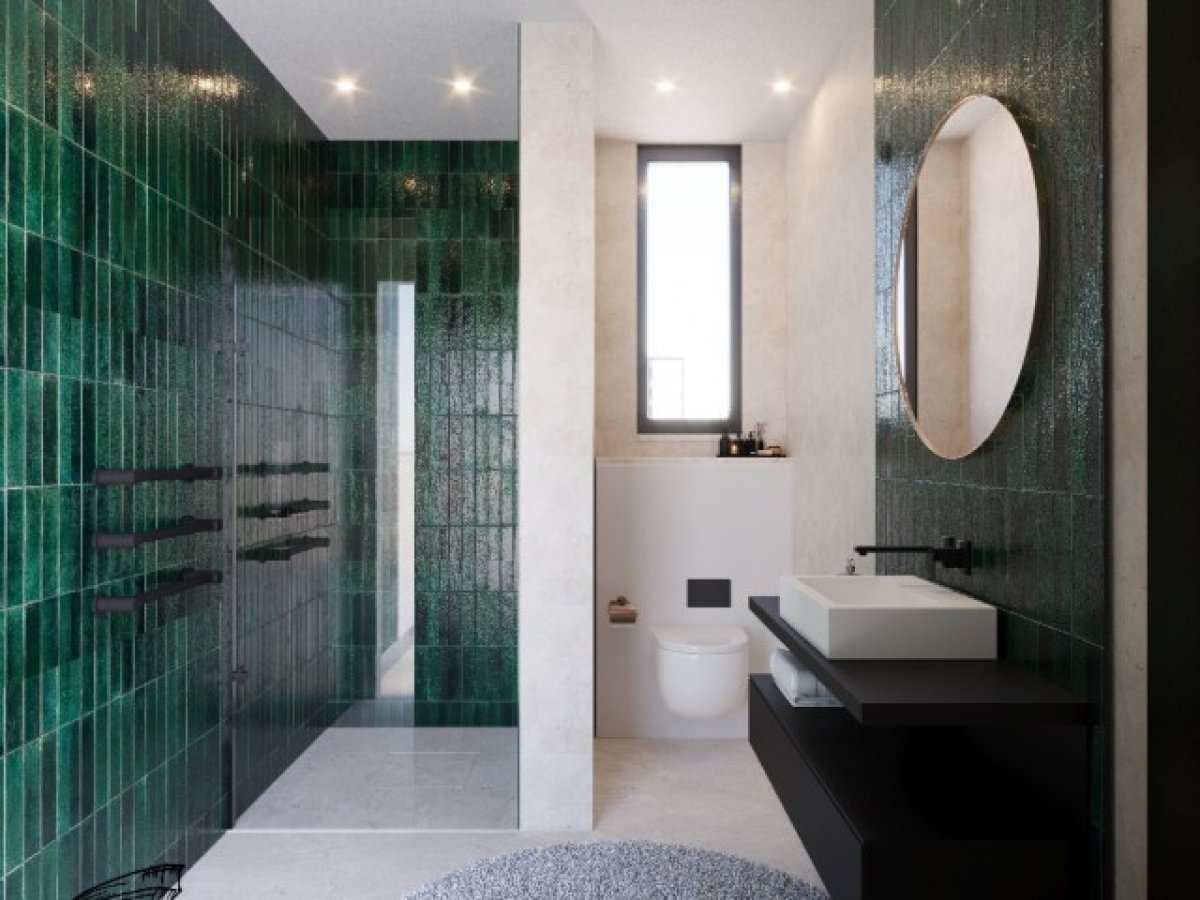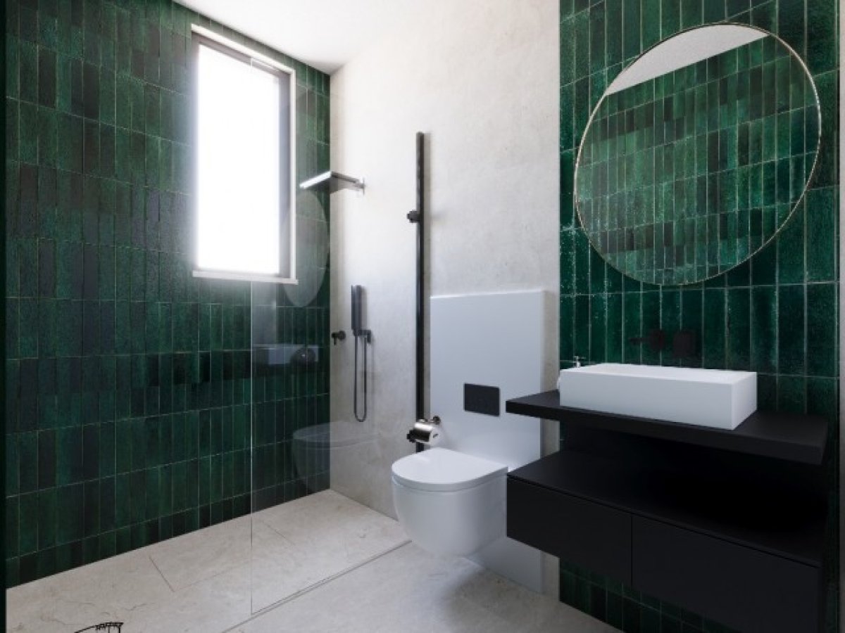 Banyolar: Modern tarz, gömme rezervuarlı klozet, MDF banyo dolapları, beyaz seramik lavabo ve cam panelli duş kabini – tüm armatürler GROHE marka
